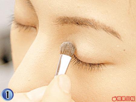 1.上好粉底,在眼窩及眼下掃金黃色眼影,眼頭多掃一點,由眼角掃向外,營造漸淡效果。