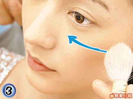 先由中心位置開始上粉,鼻樑位由眉間向下掃至鼻尖,兩邊鼻翼向下掃;額頭位打圈印開,面頰位由下向上、由內至外掃,重點是均勻掃上整塊面。