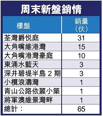 銷情較理想的新盤只有剛推出新付款安排的爵悅庭,兩天售31伙。另外,香港置業董事姚偉南表示,尖沙嘴凱旋門造價理想,帶動維港灣複式單位的銷情,兩天售出15伙,呎價6000至近8000元。中原地產區域營業經理林少禮表示,東涌水藍天29號屋,2312方呎,昨日以2300萬元成交,呎價9948元。