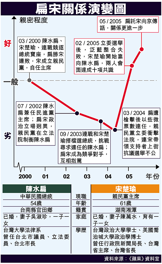 中共總書記胡錦濤與中國國民黨主席連戰上周五舉行歷史性峯會後,台灣總統陳水扁昨首度就此作出回應,聲言已邀請即將到大陸訪問、下周與胡錦濤會晤的親民黨主席宋楚瑜,代為向胡錦濤傳話,顯示「胡連會」後處於被動的陳水扁,正企圖奪回兩岸問題的主導權,而宋楚瑜亦被視作陳水扁的「特使」。台灣傳媒表示,宋楚瑜將向胡錦濤表達陳水扁不會支持台獨的立場。