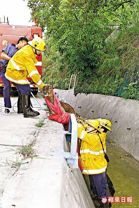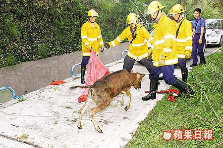【本報訊】一頭重逾一百磅的小黃牛,昨晨六時半被晨運人士發現,跌落荃灣油柑頭一條近三米深的引水道。小牛發出「胡……胡……」聲哀鳴,令人憐愛。消防員接報到場用毛氈保護雙手,箍着小牛的頸及肚將牠制服,其間小牛受驚掙扎,消防員像哄走失孩童般安慰小牛:「牛仔,牛仔,唔使驚吓,我帶你搵阿媽!」最後用索帶將牠救起拉上地面,讓牠追尋同伴。