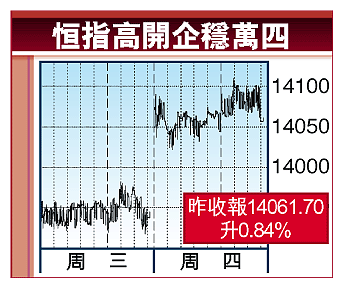 一名外資基金經理指出,雖然大市昨日升破14000點,但升幅其實不足1%,並以期指及挾倉盤主導。年初至今,恒指不斷在13300至14200之間約1000點上落,每月的波幅大概只有5%。除非恒指能一舉衝破14400水平,大市短期仍然維持上落市格局,難有大突破。再者,美股連升4個交易日,短期有獲利回吐的風險。