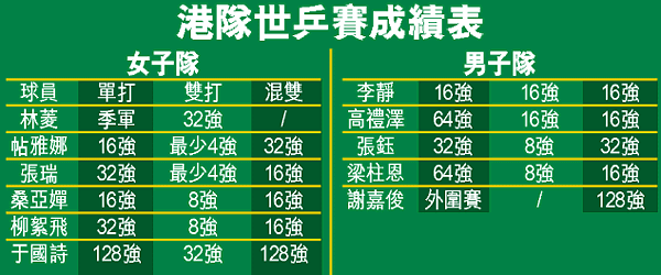 今日最後一天比賽,港隊剩下女雙組合帖雅娜?張瑞(見附表),對奧運冠軍王楠?張怡寧。休息兩天後,未知港隊能否造出爆冷戰果。