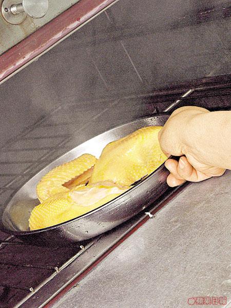 2.雞先蒸15分鐘,然後反轉再蒸10分鐘至熟,攤凍斬為4件。