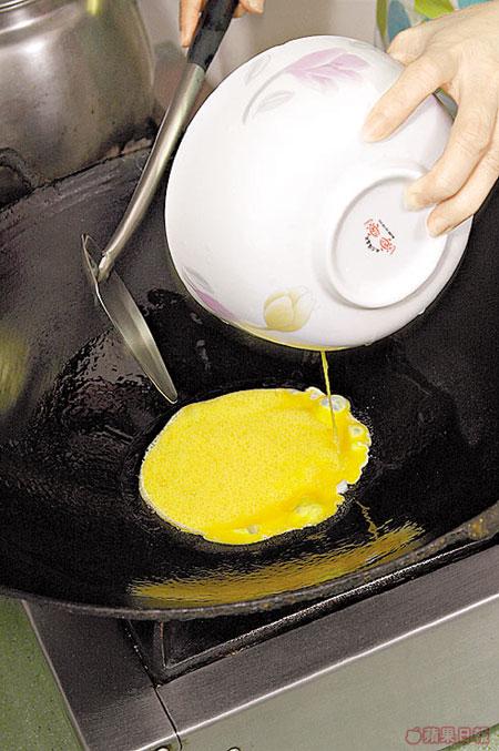 1.雞蛋拂勻,加入少許鹽及生粉,然後放入鑊中以慢火煎至熟。