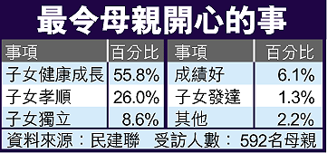【本報訊】母親節將至,民建聯進行的調查顯示,受訪母親認為最開心的事是子女能健康成長,只有極少數受訪者認為子女發達才令她們最開心。另外,逾半受訪母親為養育子女而停止工作;近六成人認為最理想是生養兩名子女,而生兒育女的最重要條件是父母有時間照顧子女。