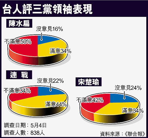 《聯合報》前日特別就近日台灣政壇人物及政黨的表現,用電話抽樣訪問八百多名民眾,結果發現,陳水扁近日的聲望,因受連戰訪問大陸影響明顯下跌,滿意度由今年三月大陸通過反分裂法時的四成一,下跌至三成四,和去年民進黨在立委選舉慘敗後的調查一樣,同為陳水扁自二○○○年就任總統以來的最低點。