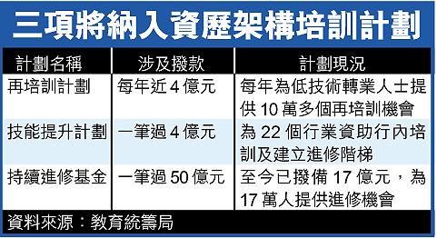 據悉,在過去十年,港府每年用在人力培訓的撥款逾五億元,教統局要稍後才能定出將來用在資歷架構培訓的撥款總額。