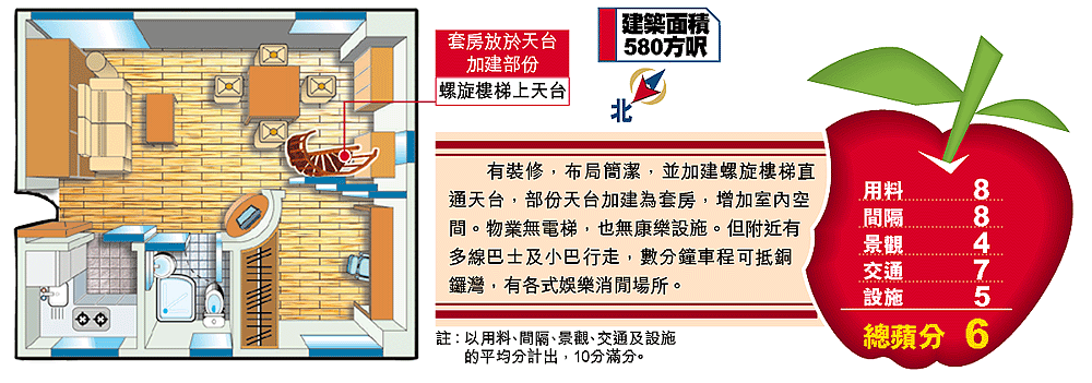 福群道路面狹窄,住宅規模細,伙數少,屬冷門物業。覺廬另類,乃紀念粵劇名伶薛覺先而建,僅16伙,5伙曾拆售,其餘仍由家族後人持有。1樓A,850方呎,連平台,2月作價488萬元,每呎5741元。這伙去年9月購入,當時作價366萬元,每呎6310元。