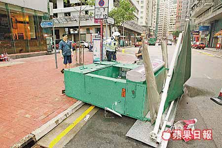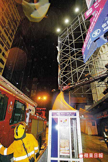 另外,凌晨四時四十五分,油麻地佐敦道金峰大廈外牆一個三十呎高二十五呎闊的巨型廣告海報被強風吹翻,搖搖欲墜,消防員接報到場升雲梯將它拆下。灣仔分域街報紙檔一個九呎高、七呎闊的鐵皮雜誌架,疑不堪強風吹襲翻倒塌落慢線。