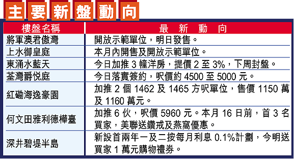 【本報訊】新盤積極部署推售,將於明天作第二輪內購的將軍澳君傲灣,新世界發展(017)昨日派發9層近100伙的價目單,由代理預先配售,料昨晚率先配售60至70伙。