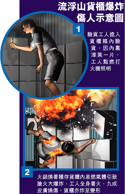 【本報訊】元朗流浮山新慶村一個貨櫃場昨發生爆炸意外,一名驗貨工人開啟一個滿載二萬公斤、高度易燃發泡膠製成品貨櫃時,疑他點燃打火機照明,懷疑火燄燒着積存貨櫃內易燃氣體搶火大爆炸。工人首當其衝遭火球燒傷九成皮膚命危。專家指意外反映工人缺乏安全意識,而肇事貨櫃遭強大氣流炸至變形,勞工處正展開調查。 記者:陳天華、姜偉康