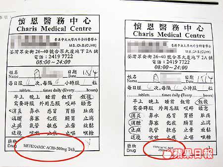 她說,取得藥物回家後準備服食時,其丈夫發現四包藥中,其中兩包藥的藥名同為MEFENAMICACID,藥袋上所列服食指引均是每日四次,只是劑量不同,一包共八粒,每粒250MG,另一包亦為八粒,每粒500MG;四包藥中並無胃藥。「我只係眼睛發炎有少少唔舒服,使唔使食咁重份量呀!」
