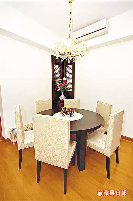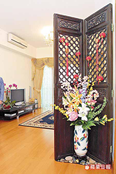 其中有三組雕花木門,變身為巨型屏風,最別致,並分布客飯廳及書房中,古樸盎然,連同字畫及瓷器花瓶等,效果錦上添花,又起輕重平衡作用,驅走侷促感。