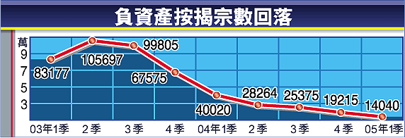 美聯物業昨日亦公布,3月底本港負資產數(只計一按貸款)降至約2萬宗,較去年底減少11.7%,較03年6月高峯期更減少88.6%。