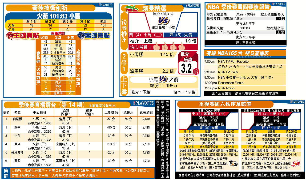 今個回合兩軍在主場的戰績均僅為一勝、二負,所以就算小馬在第七場重返達拉斯也不會有優勢。不過在季後賽第七場生死戰,經驗將成為勝敗關鍵之一。