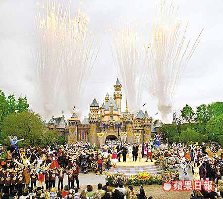加州迪士尼樂園為慶祝創立五十周年,大前日舉行名為「地球上最快樂慶祝」的巨型慶典,多位歷年來曾參與迪士尼製作的藝人,前日再次在加州迪士尼現身,為全新粉飾的睡公主城堡舉行揭幕儀式,與近萬名遊客一同慶祝。