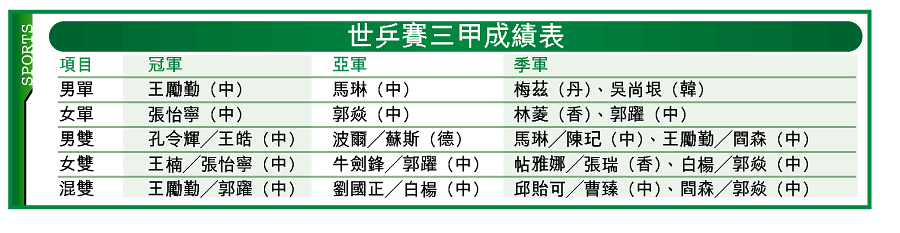 至於中國隊在今屆所得的五金四銀六銅中,以雅典奧運兩金得主的張怡寧成績最好,首奪單打及衞冕雙打金牌,為自己創下「大滿貫」後,亦為中國完成「百金夢」。至於夥拍張怡寧的王楠,昨晚成功衞冕女雙金牌後,令她平了「師姐」鄧亞萍在世界賽獲十八金的紀錄。