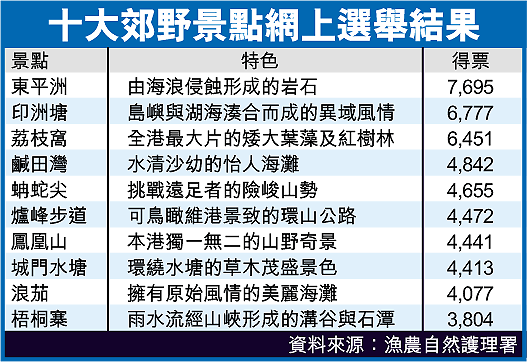 香港郊野景點選舉共有一萬多名市民投票,漁護署早前挑選了八十八個具代表性的郊野景點供投票人士選擇,每名投票人最多可選擇十個心儀的醉人景點,結果新界北區的東平洲、印洲塘及荔枝窩囊括最受歡迎景點首三位,其中東平洲更獲得七千六百九十五票成首位。