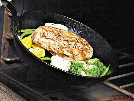 5.將雜菜與豬扒等同放進焗爐中以200度焗8分鐘,最後淋上黑松露油及放上黑松露片即成。