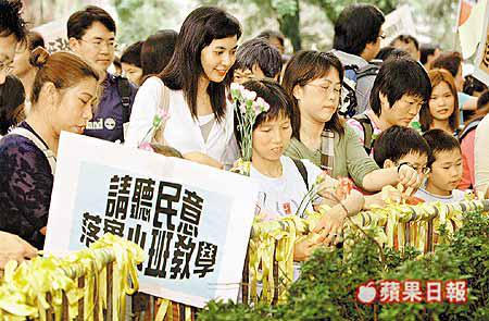 【本報訊】下過暴雨,天氣仍鬱悶,有媽媽選擇過一個不一樣的母親節,手執康乃馨、以腳步給子女走出未來,與五千名家長及師生遊行爭取小班教學,將黃絲帶繫於政府總部的圍欄。教育統籌局昨重申支持小班教學的大方向,但再次以小班研究計劃作擋箭牌,表示小班教學要循序漸進。有參與試驗計劃的學校代表則踢爆政府對小班教學有預設立場,所謂「試驗」純粹是拖延之策。 記者:張嘉雯