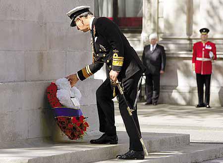 身穿軍服的英國皇儲查理斯帶領二戰老兵和數百公眾,在倫敦白廳附近的陣亡將士紀念碑獻花,向在二戰中犧牲的三十八萬八千軍民致意。查理斯新婚妻子卡米拉在附近的露台上觀看。 路透社
