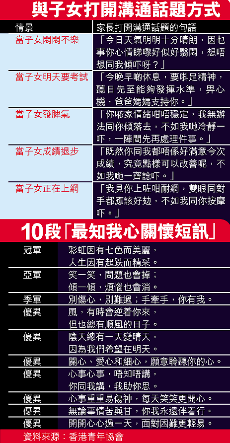 青協家長服務拓展組單位主任楊順珍說,青少年面對的壓力若長時間被忽視,可能會產生更嚴重的情緒問題,呼籲家長每日多聆聽子女心聲。青協早前舉辦「你有心事,我用心聽」短訊創作比賽,選出十段「最知我心關懷短訊」。以「彩虹因有七色而美麗,人生因有起跌而精采」獲得冠軍的吳婉麗說,以前覺得媽媽「outout哋」,所以很少向媽媽傾吐心事,日後會多採取主動。