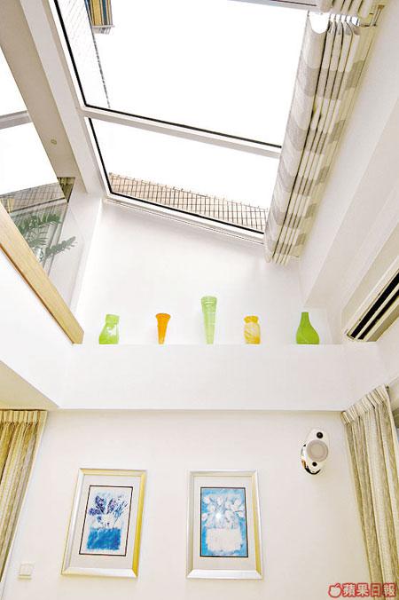 愛旅行的陳太,把香港的家也裝修得很摩登很鬼佬Feel,走進大廳,天窗收集了大量日光,再經米白的牆反射,滿室光線柔和,坐擁天窗這張王牌,就算隨意把牆漆成紅、藍或綠,效果同樣好看,只是陳太愛簡約,故依設計師提議,塗白色讓日光效果更明顯,而滿屋白的另一優點是:陳太可把外遊買回來的大小花瓶擺放廳房,作點綴,以帶出個人品味。
