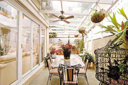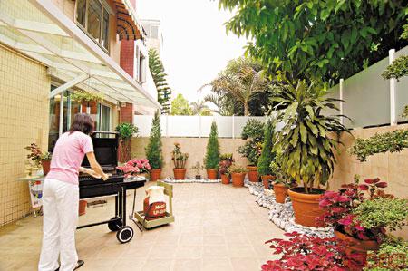 拉開客廳的趟門,走到花園去,見地上鋪滿泥啡色的大階磚,四周放滿盆栽,而盆與盆之間堆滿灰白的鵝卵石,大好花園怎不種滿一地青草?陳太笑說:「我最怕蛇蟲鼠蟻,但我每日都在花園做運動,假日又約朋友來燒烤,若在草地上BBQ會較難清理,油脂滲進泥土亦不衞生,於是設計師就提議以泥色的花盆及階磚取替泥土,看上去就很CountryTouch,不過滿地方磚,給人死板規範的感覺,加上跟花盆同色,所以用鵝卵石隔一隔,以緩和沉悶的氣氛,兼令花園帶點禪味。」哦,善哉善哉。