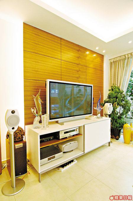 至於天花,全白太悶,加層假天花,層次感立現,燈光從天花射落地下,效果柔和舒服;大廳的牆是主牆,在電視背後加塊FeatureWall,一來襯托電視,二來避過四面都白,太吉太空曠。
