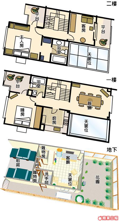 間隔:地下是花園、客廳及天窗位;一樓飯廳、睡房連廚房浴室;二樓兩房、兩平台及浴室。