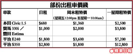 AVIS汽車租賃公司早前購入多部新款日、歐車,除本田Jazz、Civic、豐田Echo、Camry、八人車Estima等外,更有豪華平治E240。據知,該租車公司更為首間本地租車公司引入頂級平治S350豪華轎車,顧客除可選擇自駕或連司機租賃服務外,更有長期租賃服務。AVIS於本月及6月推出新優惠,凡持AsiaMiles、CitibankVisa、Master卡或各大航空公司聯營卡,日租均可獲8折優惠,兼且重有周末及一星期租約特價優惠。