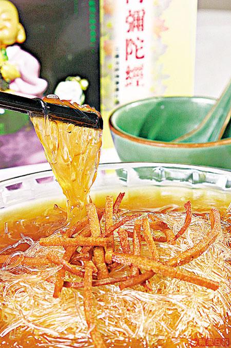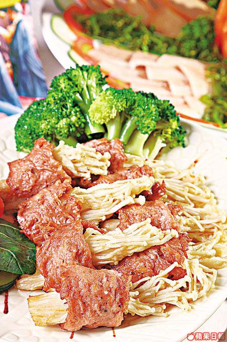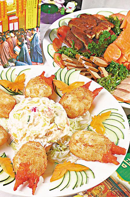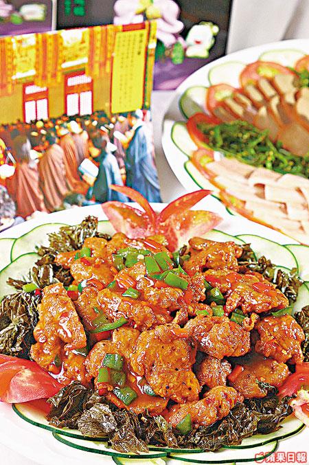 不想為點菜煩,不妨試「菩提素食館」的佛誕套餐(由2人餐$168至12人餐$1,880不等),12人套餐有紅燒素大鮑翅、菜膽上湯素雞、芝士焗素海鮮、香芋南瓜焗飯等11道菜,豐富得很。這兒的仿肉來貨多是半製成品,糊狀大豆纖維落到大廚手上,會因應菜式加香料做成不同形狀質感的齋菜,老闆葉小姐說:「半加工勝在彈性大,大廚可做出獨一無二的菜式。」