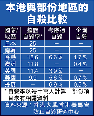 負責該調查的防止自殺研究中心總監葉兆輝昨出席港台節目《活着就是希望》啟播禮後指出,本港於前年共有一千二百六多宗自殺個案,即每十萬人便有十八點六人自殺,這較部份歐美國家為高(見表)。