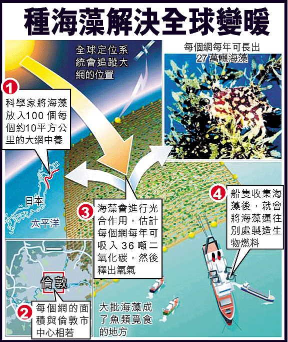 全球變暖是個不爭事實,世界各地科學家都想方設法解決這個問題,日本科學家就想到在沿岸大規模養植海藻,讓海藻吸收溫室氣體,並將它們轉化成氧氣,當海藻成長後更可用作製造生物燃料,可謂一舉兩得。若研究證明有效,種植海藻可望成為對付全球變暖的新武器。