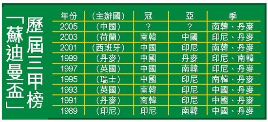 至於曾在一九八九年奪第一屆「蘇迪曼盃」冠軍的印尼隊,昨日出人意表的以三比○擊敗丹麥。對於今日對中國,該隊教練海甸拿他滿有信心的說:「如果我的球員打得像今日一樣,我想他們明日可以贏中國。」該隊的第一男單、奧運冠軍陶菲克,昨日為己隊取得單打一分後說:「今日我能夠贏蓋德(世界排名第三),明日我也有信心可以贏中國的林丹。」