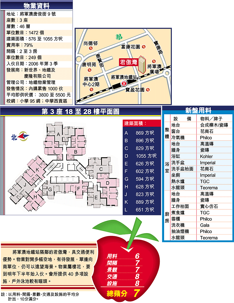 新世界發展的君傲灣,物業毗鄰將軍澳廣場,共建3幢住宅,總數1472伙,單位間隔不算花巧,逾半數為2房,3房最大面積1055方呎,戶戶設露台,但近年新樓流行的相連戶或複式則未有提供。
