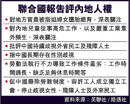 聯合國一個人權委員會發表報告,批評中國的狀況,指中國政府未能保障人民多項的經濟、社會及文化權利。報告稱,內地部門執法不力導致工人的工作環境差劣;歧視外省民工、殘障人士及婦女。委員會促請中國廢除勞教制度、容許工人成立獨立工會,以及停止歧視弱勢社群。