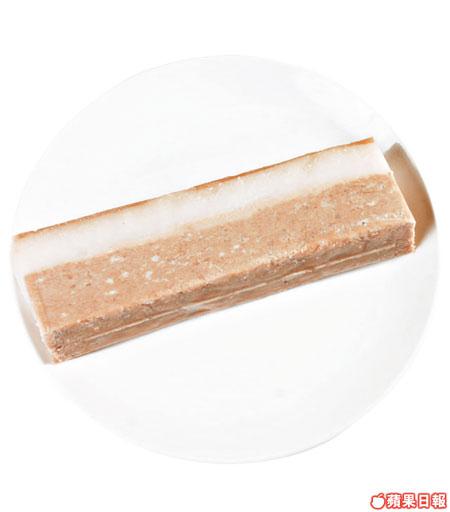 半透明蒟蒻有彈性,能做出不同質感的素肉,這層半透明仿脂肪層就是由蒟蒻與植物膠做成,彈牙爽口,極像一層肥美脂肪。