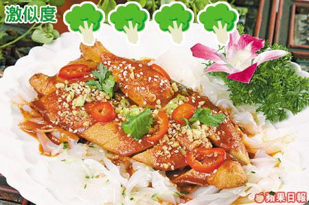 將大豆纖維倒入雞模內,倒模出來的半隻雞幾可亂真,上撒芝麻賣相一流,醬汁帶少辣,下墊的粉皮蘸汁吃極惹味。
