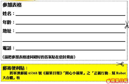 Robot機械人剛與壞蛋進行連番惡鬥,危急關頭,機械人卻慘遭奸人暗算,導致機械身軀支離破碎!見義勇為的小朋友,可否伸出援手,替機械人重新合體,好讓他能再次與壞人周旋。成功將下圖機械人重新拼砌的十位小朋友,將可獲得由DoubleA送出的文具系列乙份(包括DoubleARobotA4筆記簿、DoubleARobot鎖匙扣、DoubleAPostcardNotebook及A4影印紙禮包)。