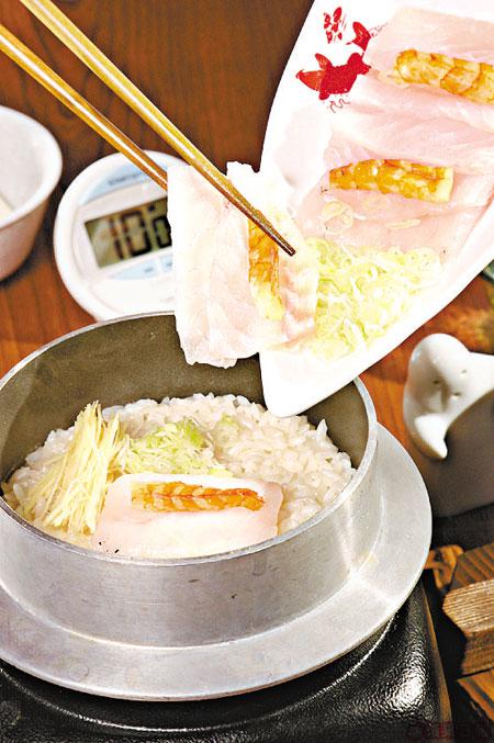 1.過癮釜飯讓你親自操刀!鍋內有預先洗乾淨的米粒,蝦乾與鮮魚片同時上桌。