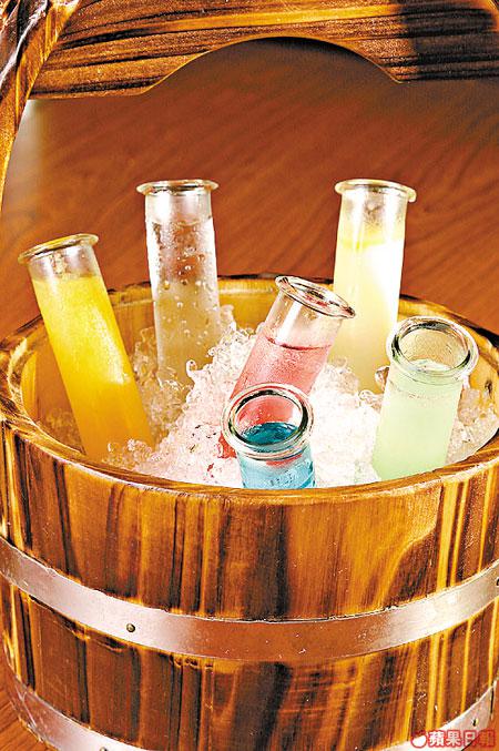 用木桶盛載冰鎮上,試管內的6種酒分別是雞蛋酒(黃)、藍橙酒加Tequila及梳打(藍)、蜜瓜酒加菠蘿汁(綠)、Tequila加石榴水及青檸汁(紅)、水蜜桃酒加白蘭地及橙汁(橙)、VodkaLime(白)。