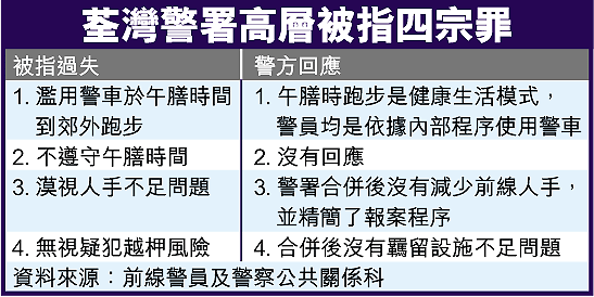 【本報訊】警方去年八月把荃灣及梨木樹分區警署合併以節省資源,統領兩個警區的荃灣警區指揮官顧履勤被指漠視人手嚴重不足問題,更涉嫌濫用警車,與多名警官於午膳時間到郊外跑步,警方否認指控,辯稱警隊提倡健康生活,鼓勵警員午膳時間做運動,但承認有警員藉此坐「順風車」。 記者:羅偉光