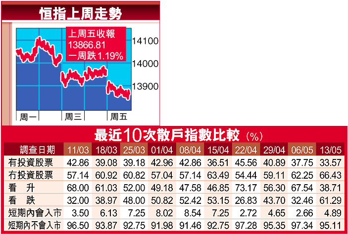 本報上周五晚所做的散戶指數電話調查顯示,93名有投資股票的被訪者中,只有38.71%認為本周港股將反彈,看好者比例創最近10周新低,較前周大減逾28個百分點。至於一些沒有投資股票的市民,入市意欲上升,上周184名被訪者中,有4.89%表示短期內會入市,高於上次的2.66%。
