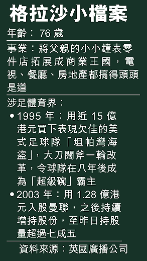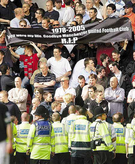 在補時階段負隅頑抗的曼聯球迷,在鳴笛一刻最終未能扳回敗局,他們最擔心的事終於發生──美國富商格拉沙(MalcomGlazer)在周一倫敦股市重開後,即傳出成功買夠將英超球會曼聯私有化所需的百分之七十五股權,令「紅魔鬼」這間全球最富有球會易主,由曼聯前球星簡東那口中說不懂足球、只會賺錢的美國班主領班。