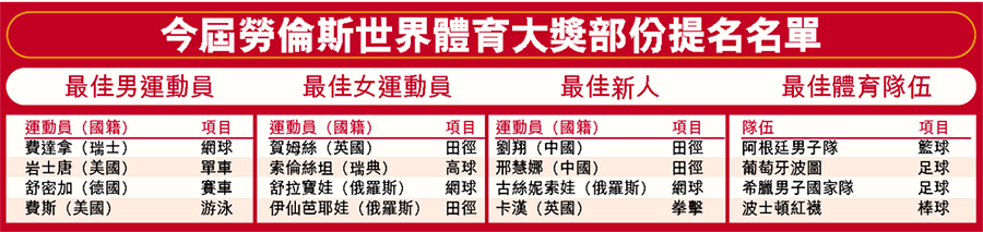 今年進入第五屆的勞倫斯世界體育大獎,由四十位運動界名宿擔任評審;為中國奪取第一面奧運男子田徑金牌的劉翔,預料可壓倒中國女跑手邢慧娜、俄羅斯女網球手古絲妮索娃等,奪得最後新人獎。