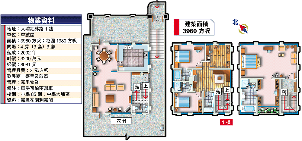 利嘉閣李淑蓮說,A1及A2型屋有3個放盤,普遍叫價3200萬元,以介紹的單數屋最優質。5月初,貨尾10號屋,3960方呎,花園1690方呎,以2608萬元售出,呎價6586元,現尚餘兩間待售。