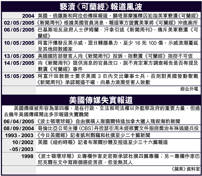 美國《新聞周刊》一篇指美軍褻瀆《可蘭經》的報道,觸發阿富汗等回教國家流血示威浪潮,死了至少十六人,傷了過百人。正當回教世界的怒火愈燒愈旺,《新聞周刊》卻說他們的報道有錯,不能肯定美軍是否有將《可蘭經》沖進廁所,並向死傷者致歉。美國國防部指摘《新聞周刊》煽風點火,白宮亦指《新聞周刊》這篇引述匿名消息的報道破壞了美國海外形象。