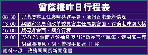 曾蔭權昨在北京參與《財富》全球論壇開幕禮,晚上約七時儀式舉行前,胡錦濤與數名中央領導人在人民大會堂東大廳接見七十多名商界人士,曾蔭權、澳門特首何厚鏵及多名香港富商均有參與會面。胡錦濤先與主辦論壇的時代華納公司董事長理查德.帕森里握手,之後便與曾蔭權握手,兩人握手十一秒鐘並寒暄數句話,其間曾蔭權滿面笑容,神態輕鬆。